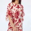 Lightweight sheer cover-up dress featuring a bold scarlet botanical print, relaxed silhouette, and adjustable gathered waist for effortless summer styling. Perfect for layering over swimwear with minimal accessories for an elevated resort look.